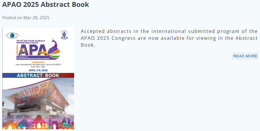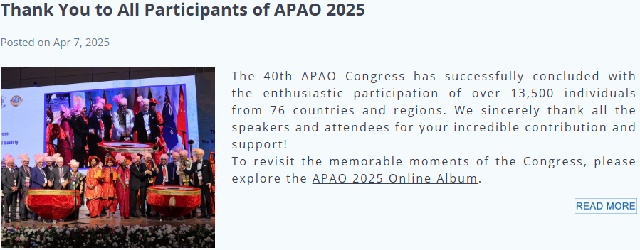 On behalf of the Asia-Pacific Academy of Ophthalmology (APAO), I am honored to welcome you all to the 40th APAO Congress to be held in the vibrant city of New Delhi, India from April 3-6, 2025.